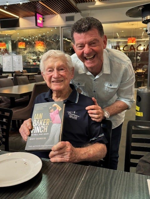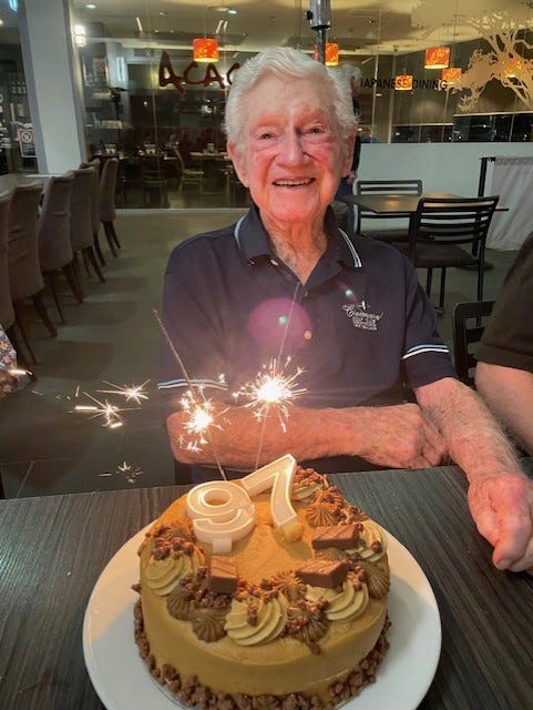 Who’s this sprightly figure seen out and about in Christchurch last week with sparklers in his cake? Celebrating 97 years young with son Bruce and kin was Et Al fave Neil Harvey, outliver of all his fellow Invincibles, two wives and a biographer.