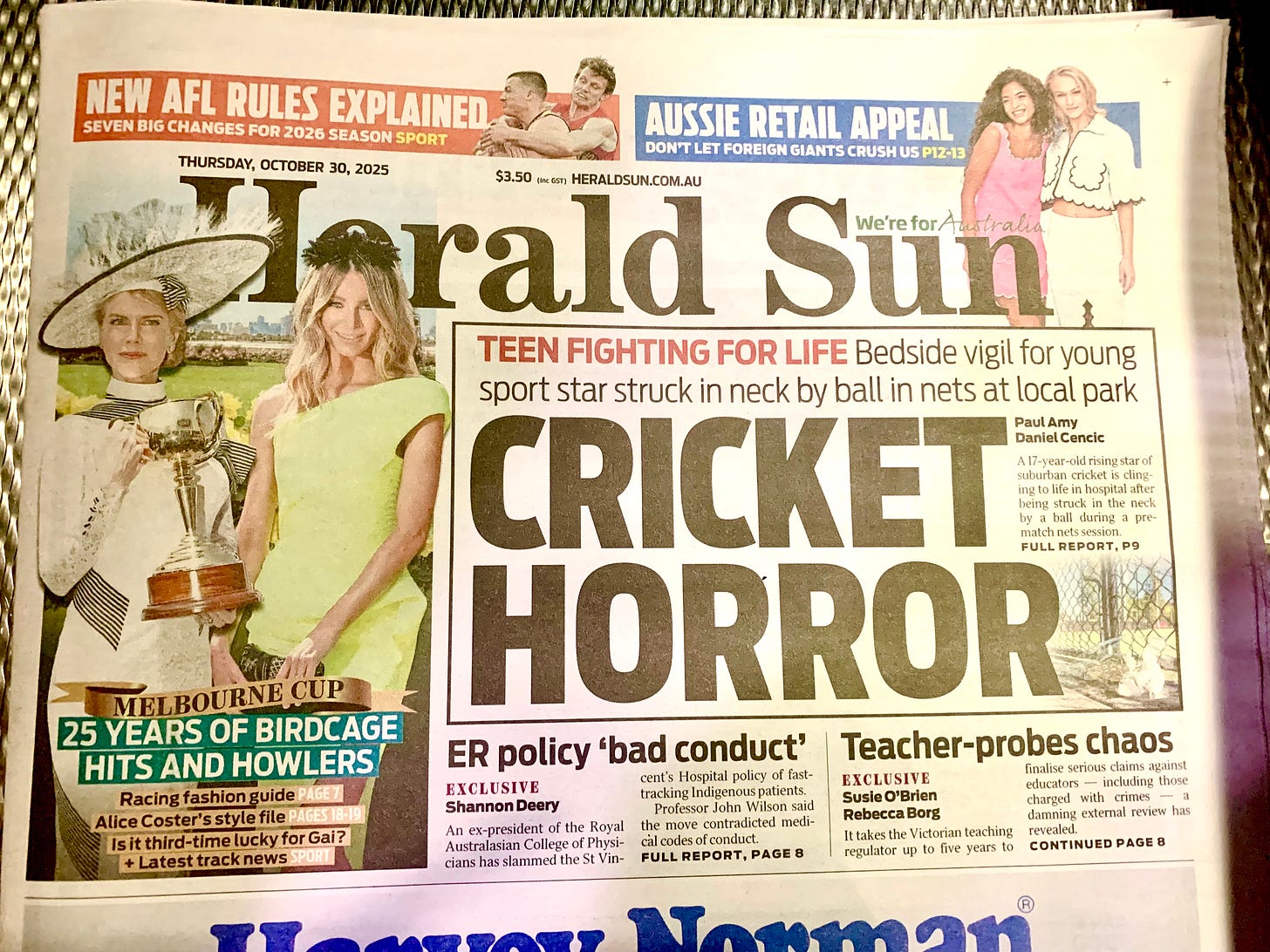 Perhaps you have a story like this too; perhaps you have been turning it over in your mind these last couple of days, in response to the ghastly news of the death of seventeen-year-old Ben Austin in the routine environs of a wanger warm-up for a twilight match. An event like this touches everyone in cricket’s community - the women wore black armbands in Mumbai last night, and so will clubs in our association this weekend. It reminds us of randomness and chance - cricket’s defining characteristics. It reminds us of sporting risk and human vulnerability - the body, we are forced to acknowledge, cannot be completely protected. It reminds us of a parent’s gravest fear every time their child closes a door behind them, while knowing that those doors must be allowed to close if a child is ever to have their own life.