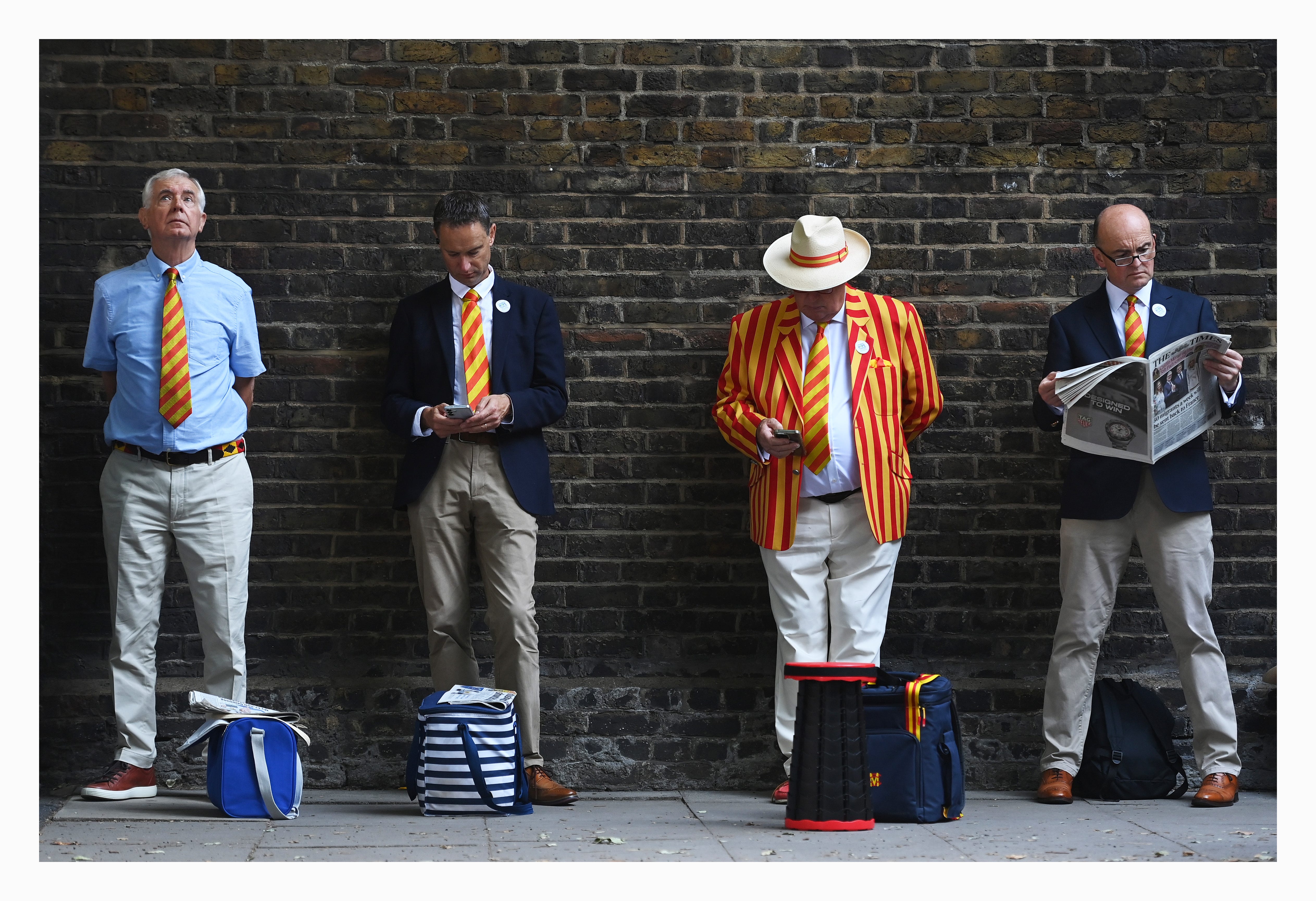 In 2025 before England played India I ventured out on to St. John’s Wood Road to check out the scene. I came upon a few men lined up and they happened to be spaced out really nicely. I don’t mean ‘spaced out’ as if they’d been on magic mushrooms or ketamine by the way. I mean the distance between them was very similar. So they were neatly lined up with various amounts of MCC gear on. Three just the egg and bacon tie, but one had the load: hat, blazer, tie, handkerchief and branded bag.