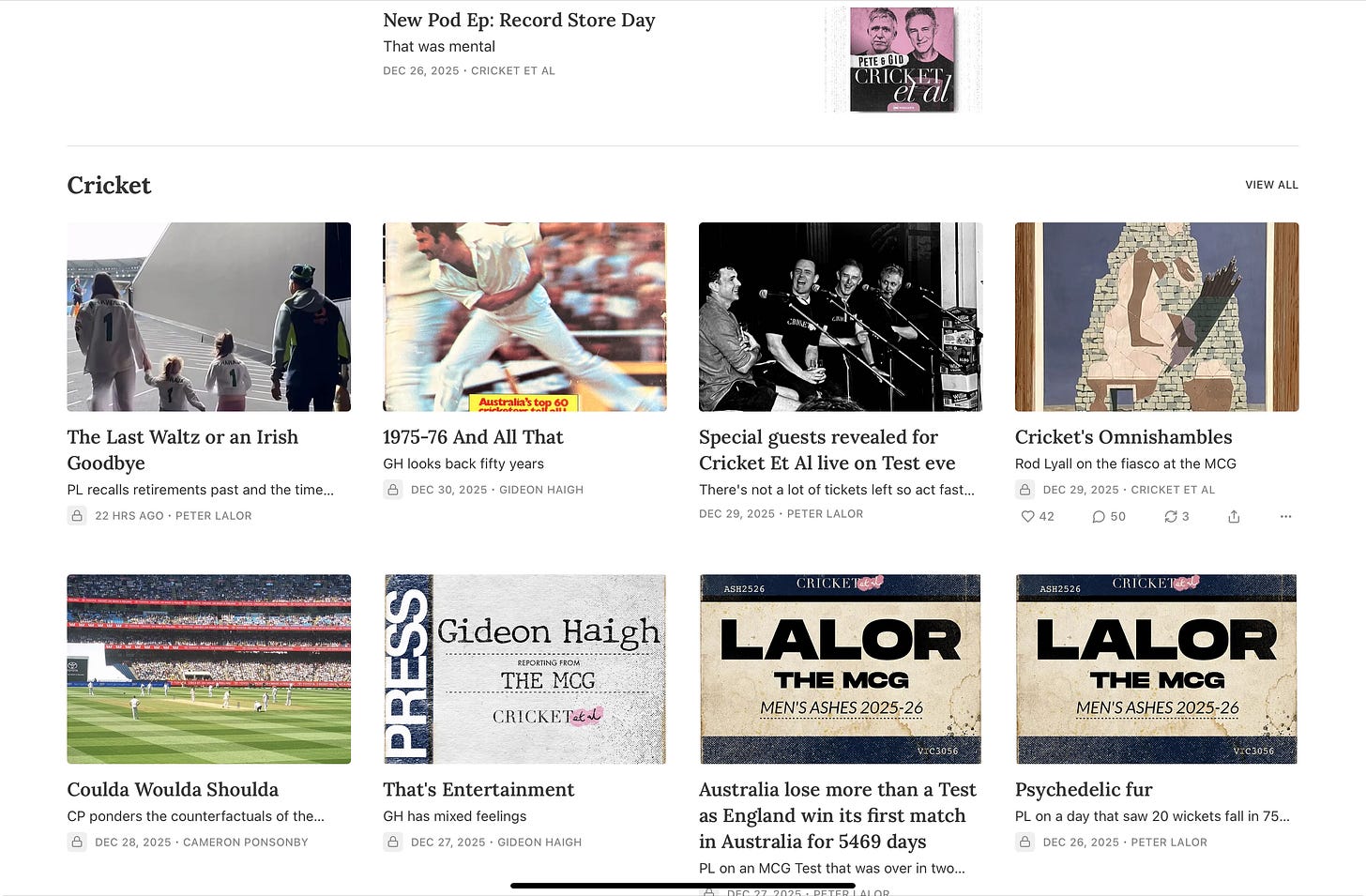 Cricket Et Al subscribers received 450 posts in the 2025 calendar year, and according to my rough count, listeners were bombarded with 79 podcasts from us across that same 12-month period. Australia played 11 Tests in the year, and Et Al was there for all 11 (the same cannot be said for the majority of the players).
