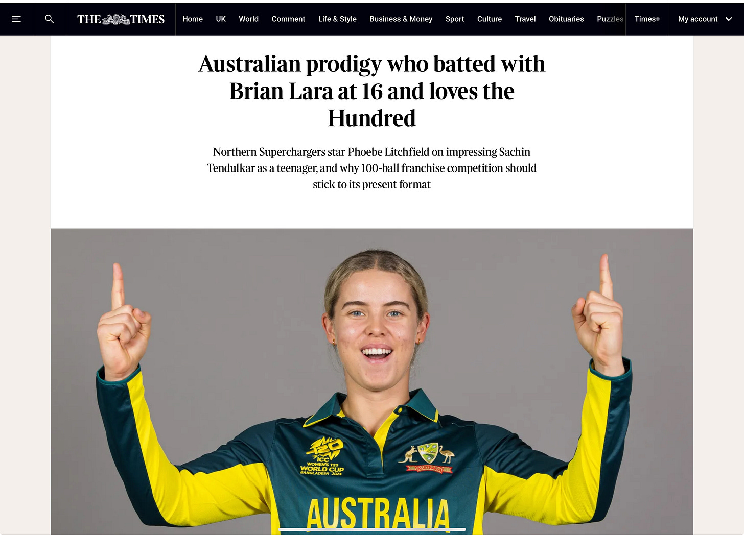 The UK Times is an essential subscription for cricket fans because Michael Atherton is one of England’s must-read journalists. Elizabeth Ammon is also a very good news source (and a source of endless amusement in the press box). The paper’s Neil Squires did an interesting interview with our Phoebe Litchfield this week in which the lively 22-year-old announces that The Hundred is her favourite tournament.