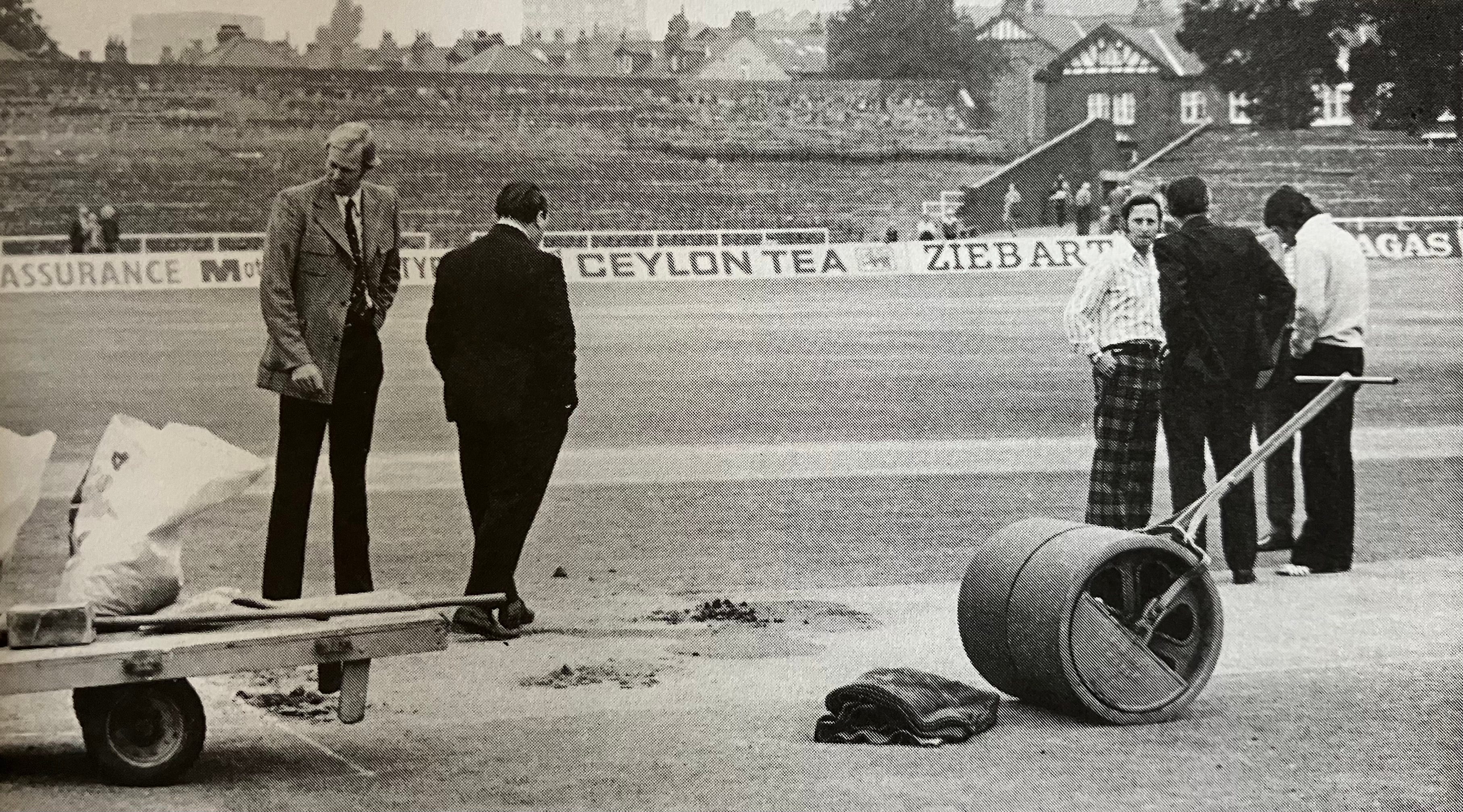 Ian Chappell, who had had had a big night in a Leeds casino with Rod Marsh and Richie Robinson, was disgruntled to be woken at 8am by a call from his manager Fred Bennett. He sobered up quickly when Bennett advised: ‘The wicket’s been damaged by vandals. We have to go straight to the ground.’ He dressed quickly - in photographs you can see his flip-flops, which contrast with his rival Tony Greig’s sports jacket and tie, and also umpire David Constant’s check pants.