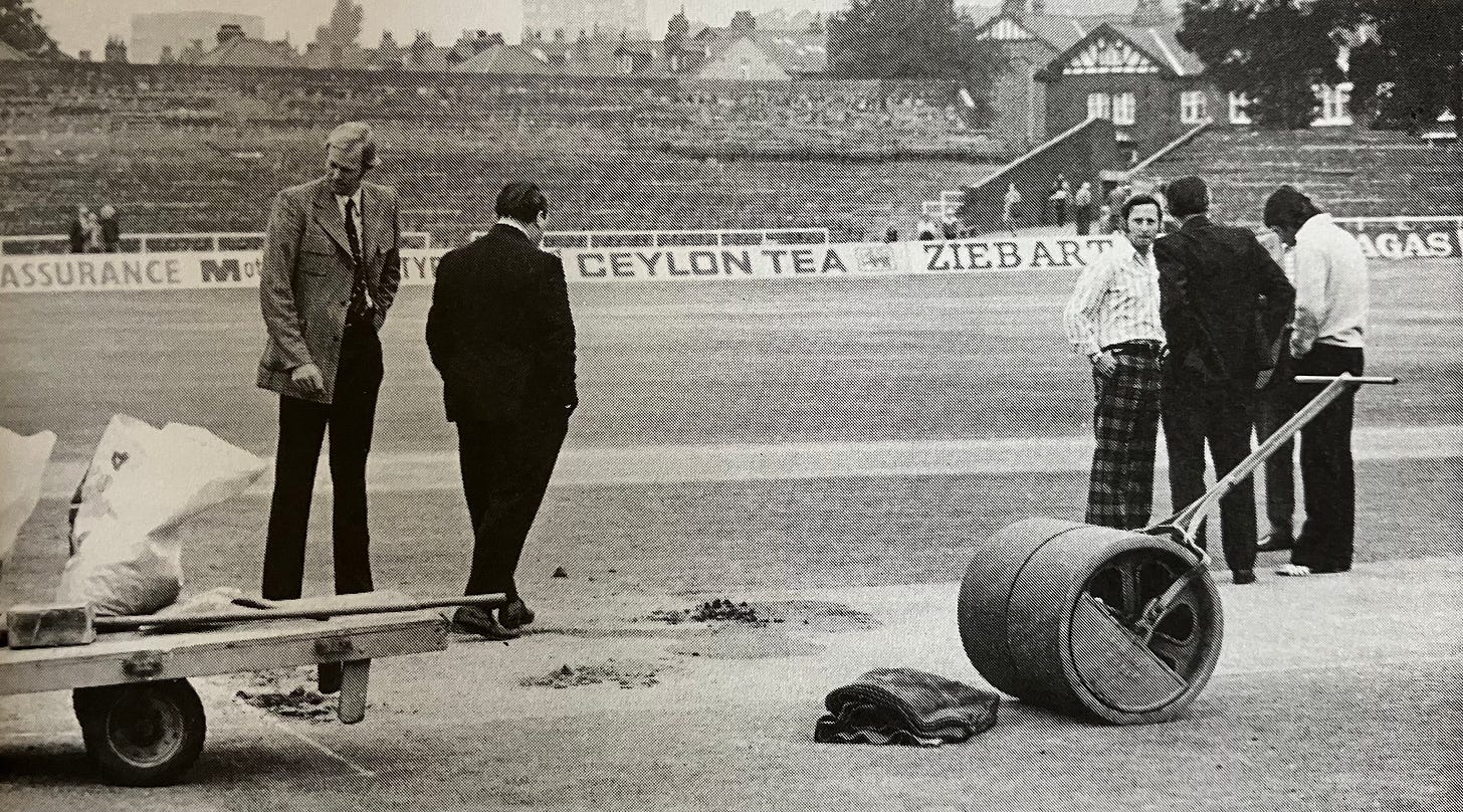 Greig, who had also passed a sleepless night hoping for overcast skies next morning and been overjoyed to see them on opening the curtains, had already received the bad news from Yorkshire CCC secretary Joe Lister. He wondered at first if the pitch could be restored - not in almost a hundred years of Test cricket had a game ever been abandoned under such circumstances. Chappell himself was concerned that Australia should not be seen as ‘taking the easy way out’.