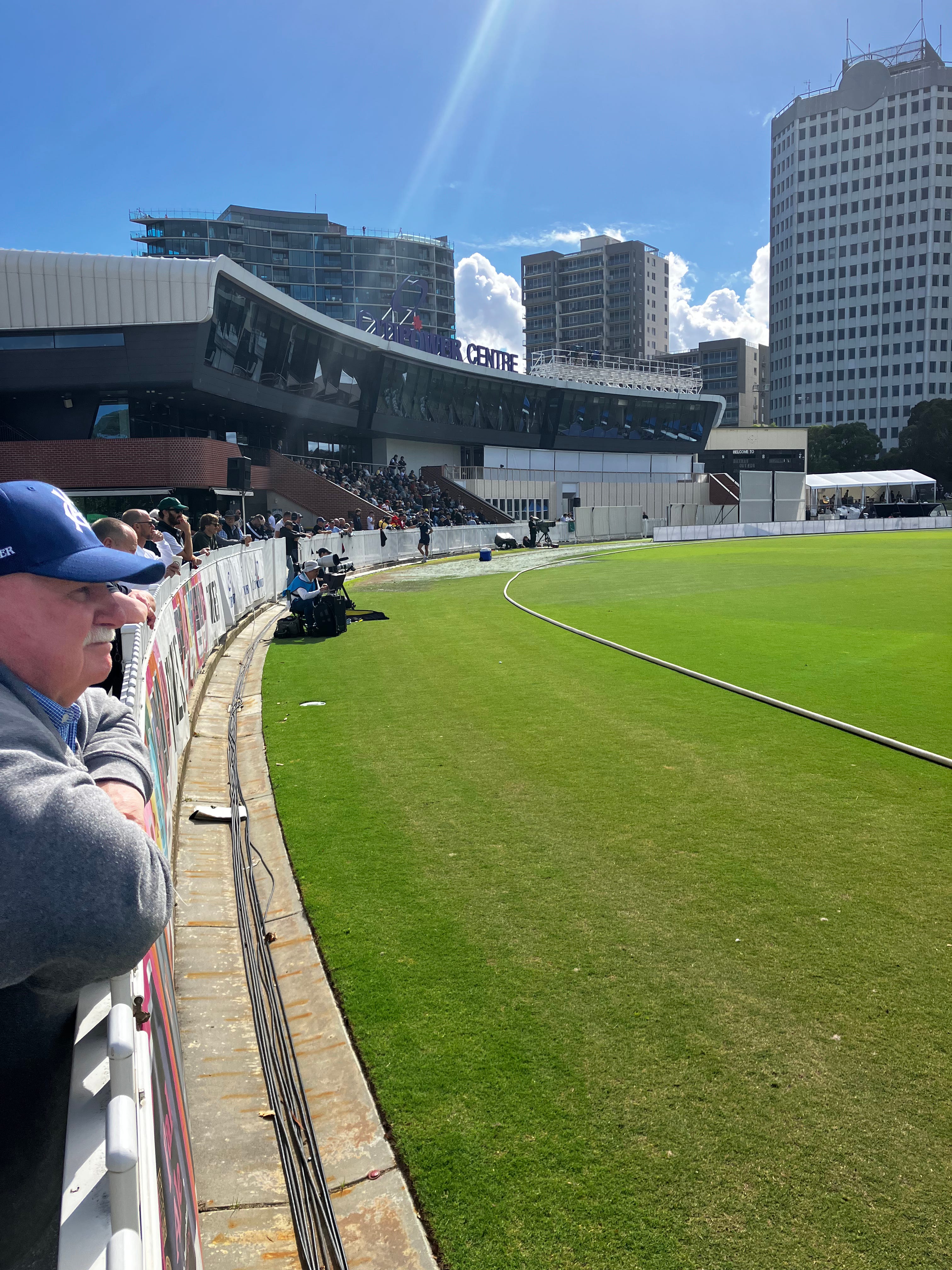 Actually, today was a lovely day, as long as it lasted. I spent most of its twenty-eight tense overs with the community of watchers who cling to the fence, enjoying the rarity of cricket near enough to hear and seemingly close enough to touch. In lots of ways, the experience of first-class cricket at Junction Oval is nearer the game I played last weekend to the game at Chinnaswamy Stadium this weekend, although the standards are at variance.