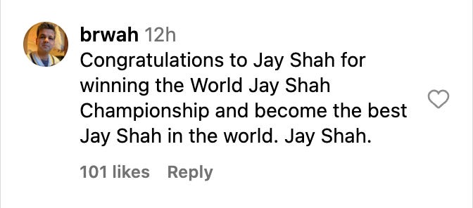 Just thought I’d google this Jay Shah bloke - does he open the batting or is he a fast bowler- maybe he’s an Umpire - I might as well google cockswamble too but I love it anyway