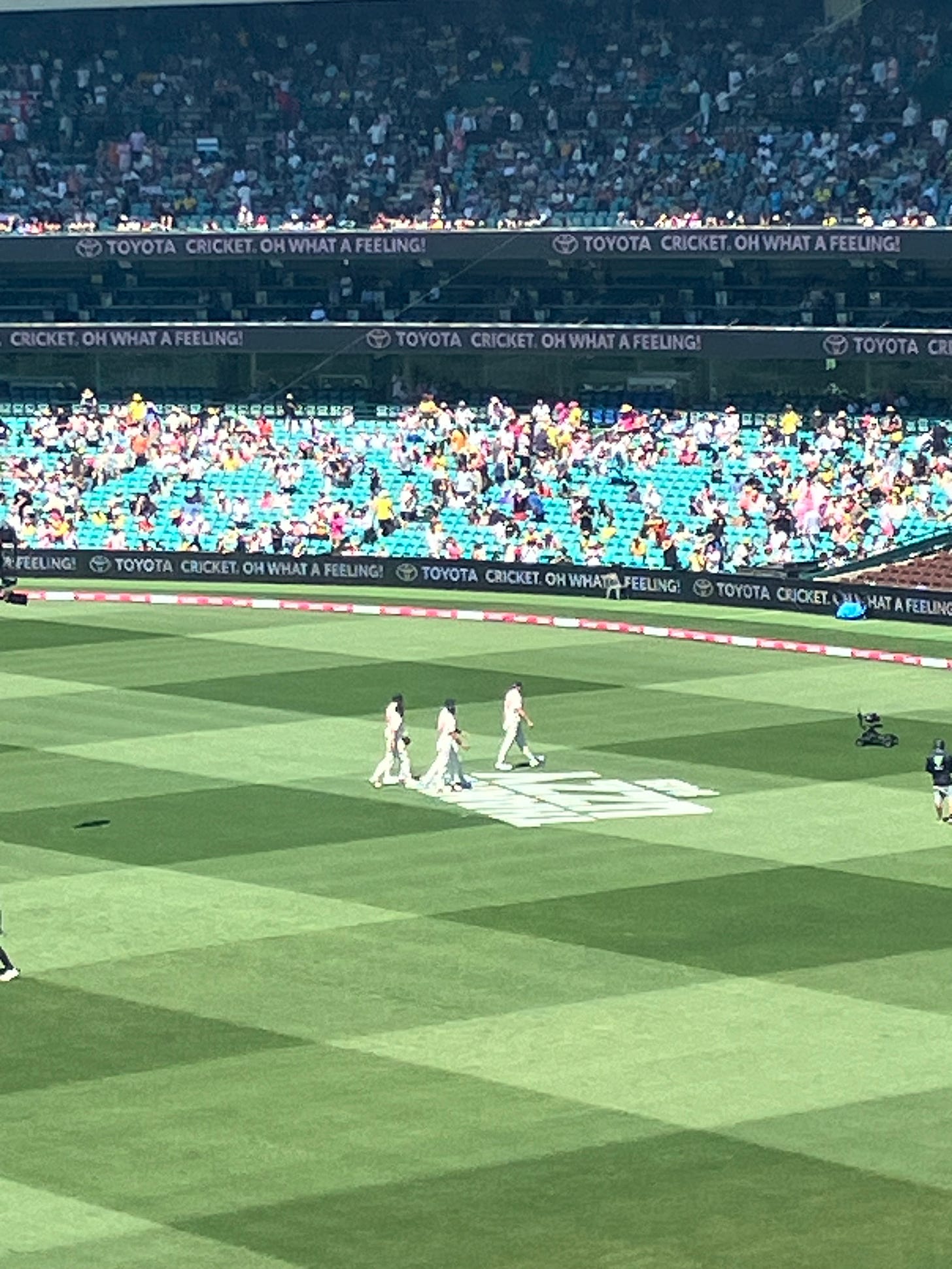 As the Australians headed for the sheds with the end of England’s innings, the top three batters leading the way in the scurry to pad up, Mitchell Starc, Scott Boland, Michael Neser, Cameron Green and Beau Webster, a hundred and seventy overs between them these five days, came together for a ritual handclasping and backpatting, before coming off, a team within the team.