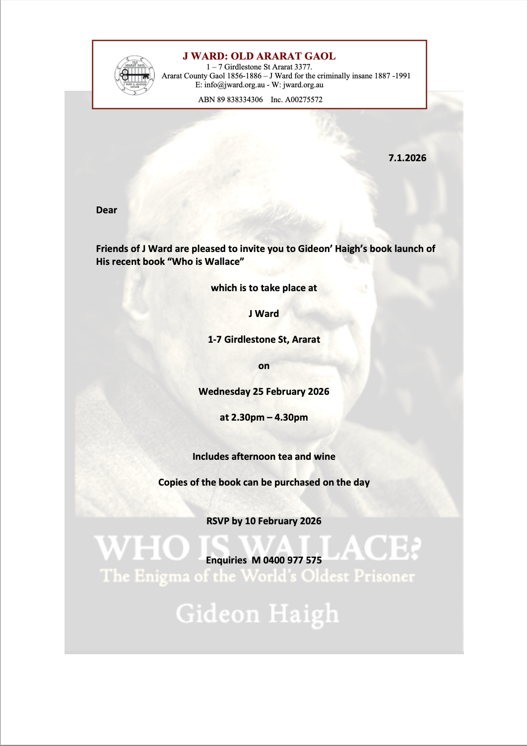 I wrote about the story of Bill Wallace here, and am still selling copies, which have now followed me from my old kitchen to my new one - just to reiterate, send me your address (gideonhaigh@hotmail.com), deposit $50 in bsb 733152, acct no 525322, and Who Is Wallace? is yours. You can get them at Readings too. Also should you be in Ararat on the afternoon of Wednesday 25 February, I’ll be launching the book at J Ward, the former Ararat Gaol that for more than a century was last stop on the line for Victoria’s criminally insane, and is now a brilliant community museum.