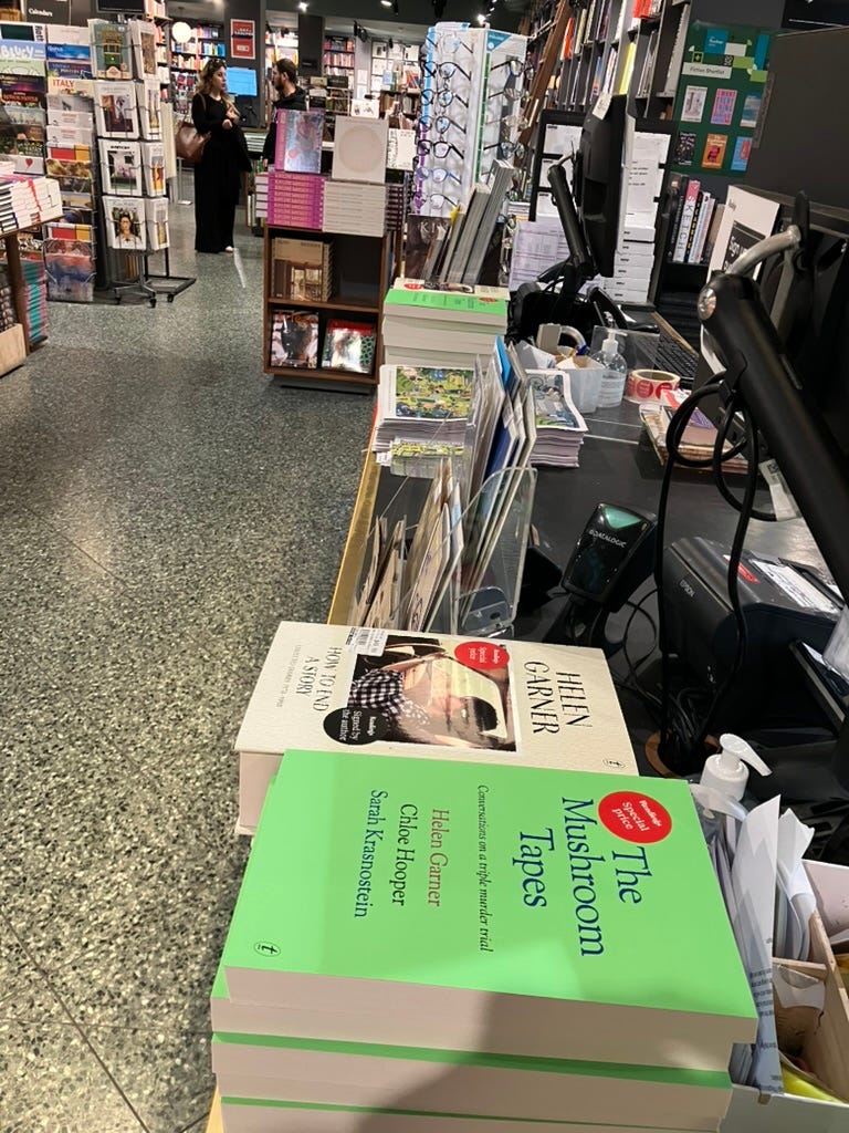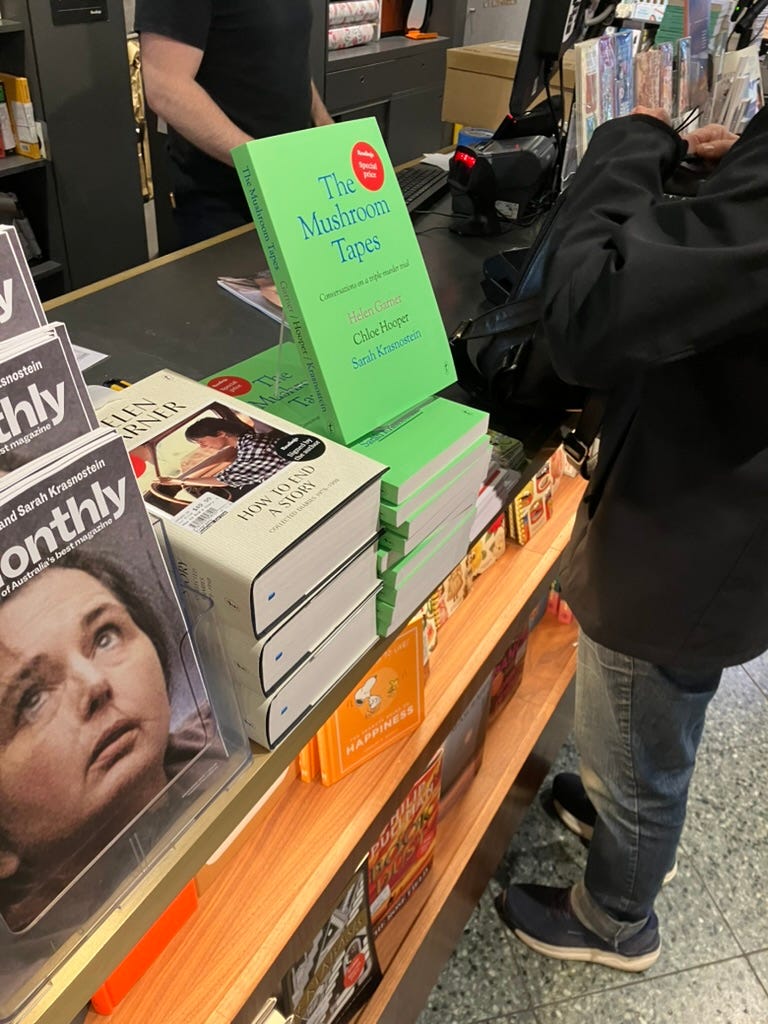 It is hard to miss The Mushroom Tapes by Helen Garner, Chloe Hooper and Sarah Krasnostein, either singly, in the sickly green wrap that looks like it belongs around uncorrected proofs….