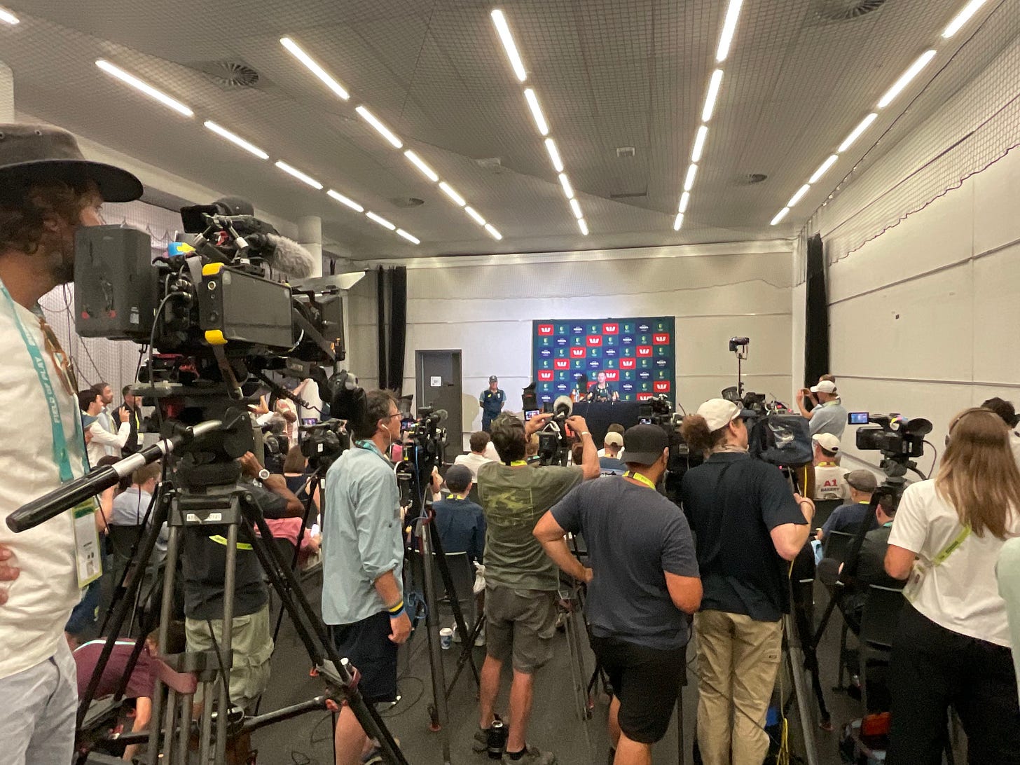 “I was pretty relaxed, but the moment I opened the door it was clear this was different to anything I’d done before,” he wrote in his autobiography. “For starters, it was the size of it. There were so many people crammed into a section of an odd-shaped space which is also the media dining room. There was a different mood, a different feel, it was tense, as if the journos were nervous about the big series and you could almost see a split in the media in the way they’d arranged themselves with the Australians on one side and hte English on the other.”