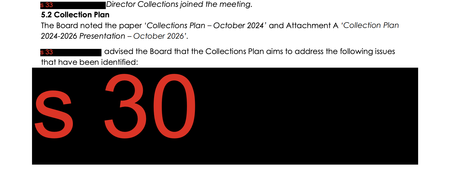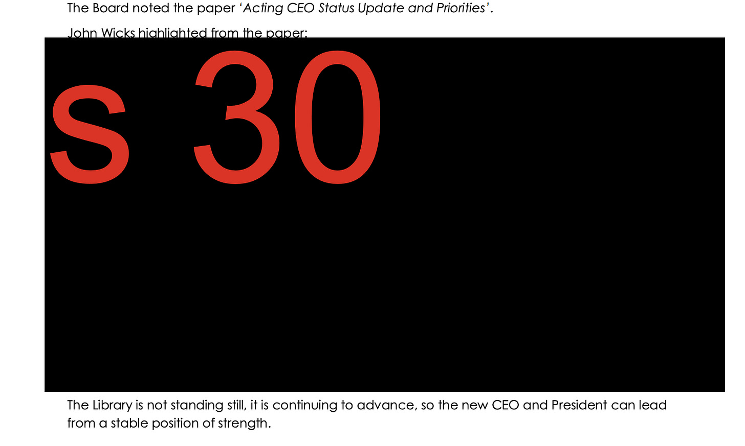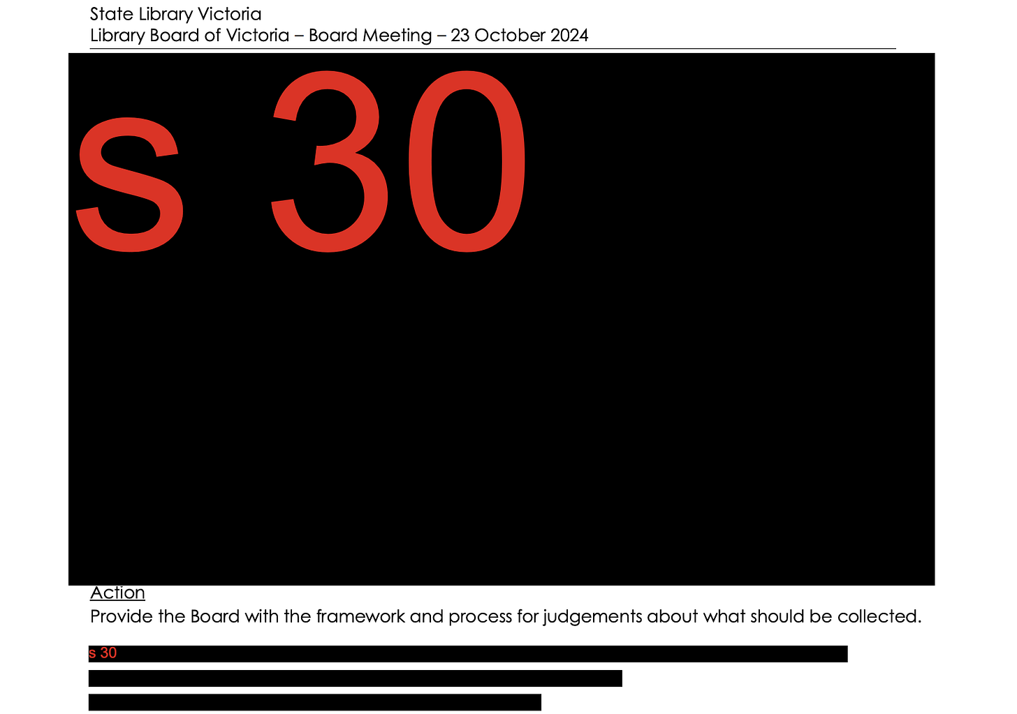 Section 30 of Victoria’s 1982 Freedom of Information Act is the one exempting documents whose disclosure would be ‘contrary to the public interest’, and, believe me, it gets a solid workout in this tranche. You wouldn’t, for example, have thought a library collections plan was such hot stuff it needed this level of redaction….