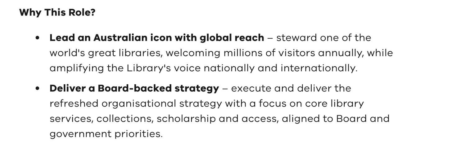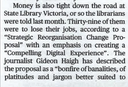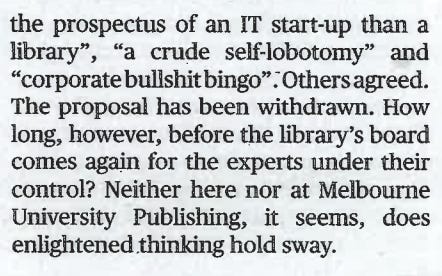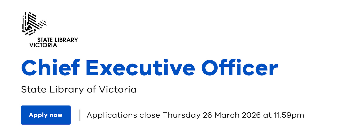 Phew! Can the strategy really have been so ‘refreshed’ that it’s now something else entirely? Probably not - likelier it simply heralds a less overt, more piecemeal approach to the same overall end. Whatever the case, one also wonders exactly what a potential CEO would think of stepping in to implement a strategy already formulated, strongly resisted and temporarily stymied, at an institution with a demoralised workforce and damaged reputation, whose wholesale corporatisation has even extended to killing off one of Melbourne’s favourite cafes. If you’re following this from the UK, for example, you’ve probably already read last month’s take in the Times Literary Supplement.