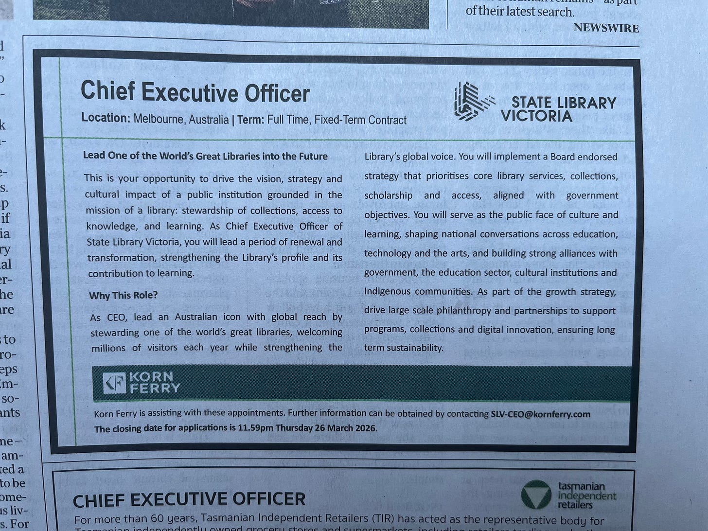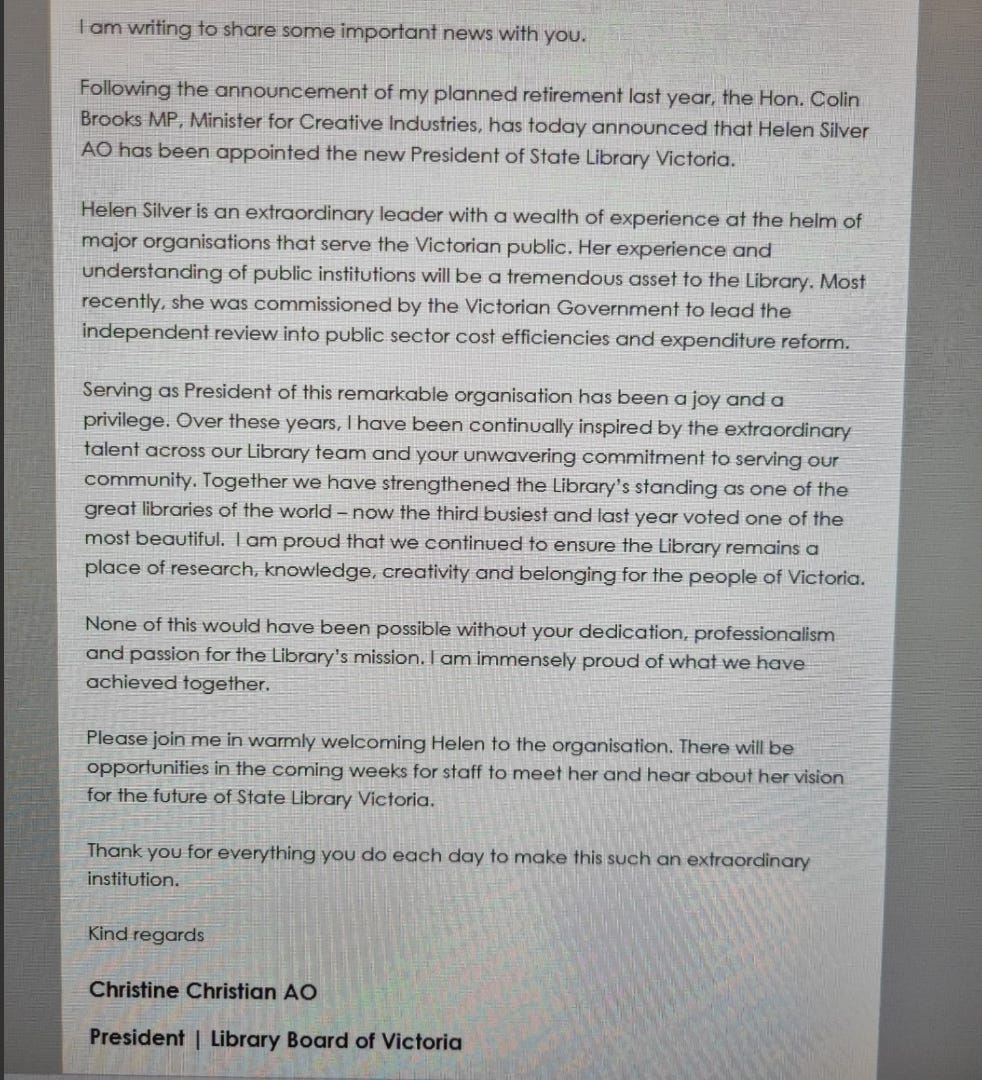 Of course, I’m not sure that Silver should already have a ‘vision’ for the State Library - she might be better advised in these ‘coming weeks’ to listen rather than talk, for the library’s institutional knowledge is almost as valuable as its great collection. But let’s give Silver, and her impressive CV, a cautious welcome, along with new directors Peter McPhee and Christine Mackenzie, and hope for the best with the CEO search, given that it was such a dud last time. Et Al will, of course, be watching.