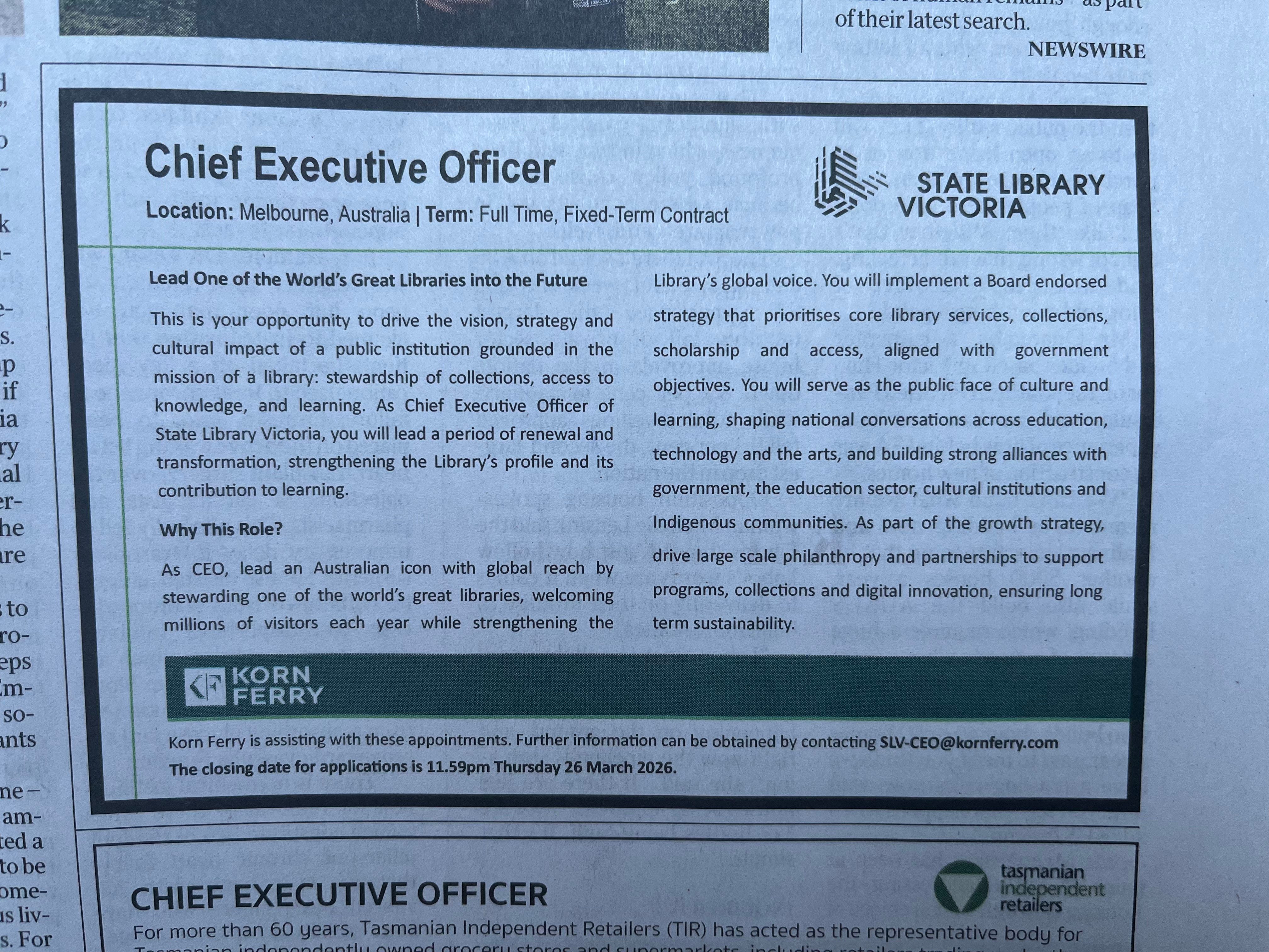 I'd like to think the CEO would perform the standard, traditional functions of a Library with the capacity to embrace reasonable adjustments as life and the world change. Which the Government should be in full support of.